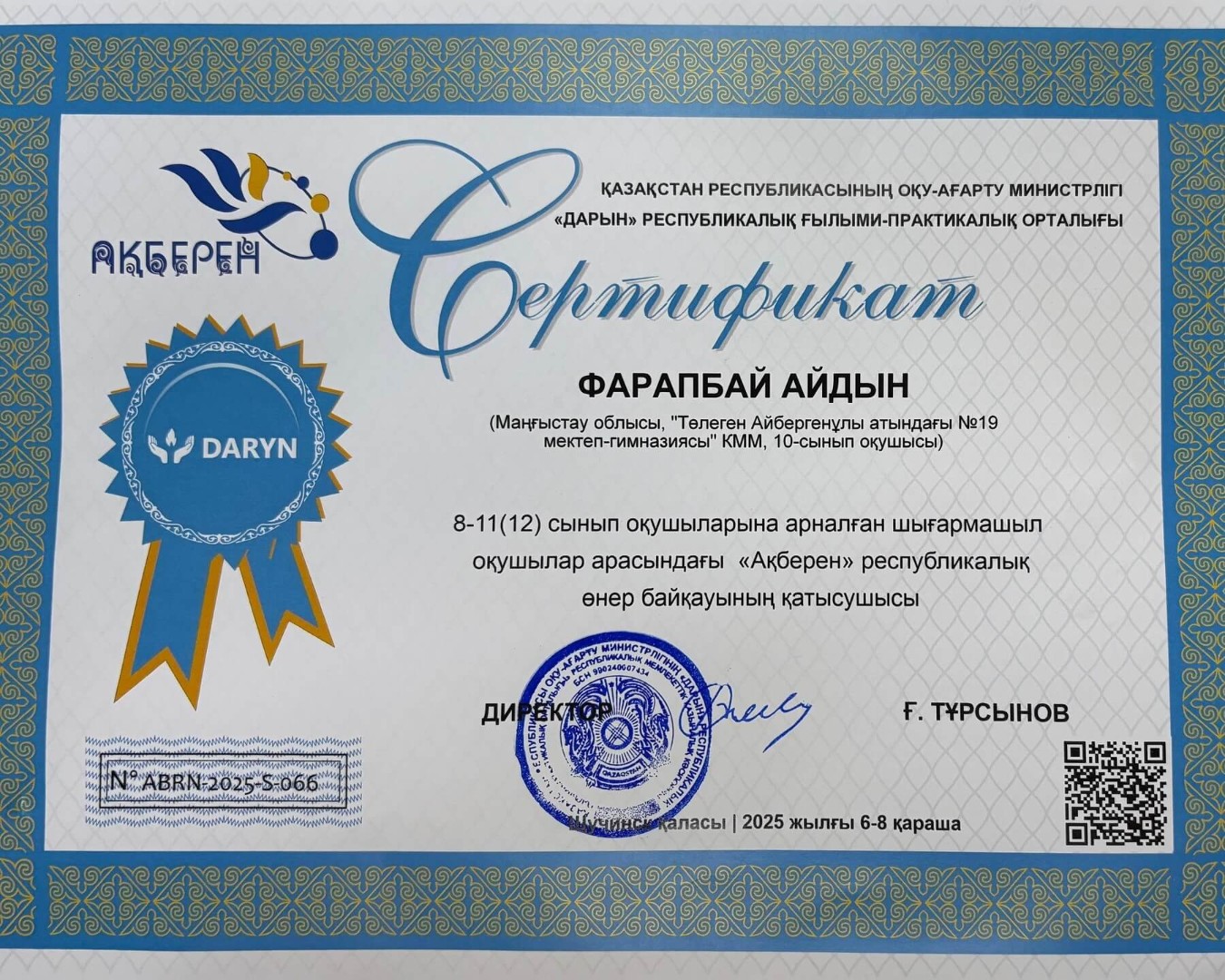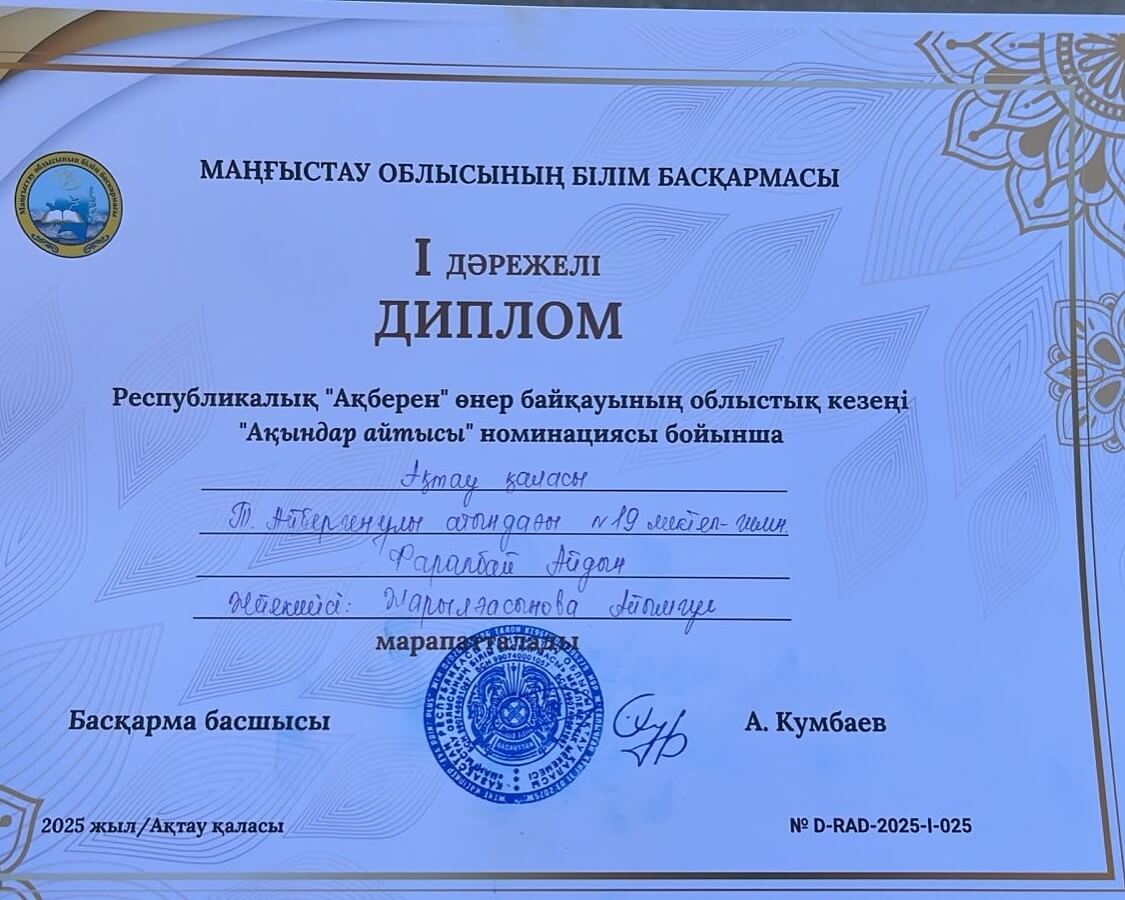Республикалық «Ақберен» өнер байқауының «Ақындар айтысы» бағыты бойынша қалалық, облыстық кезеңнен оза шауып, республикалық кезеңнен көп тәжірибе жинап келген 10-сынып оқушысы Фарапбай Айдын.